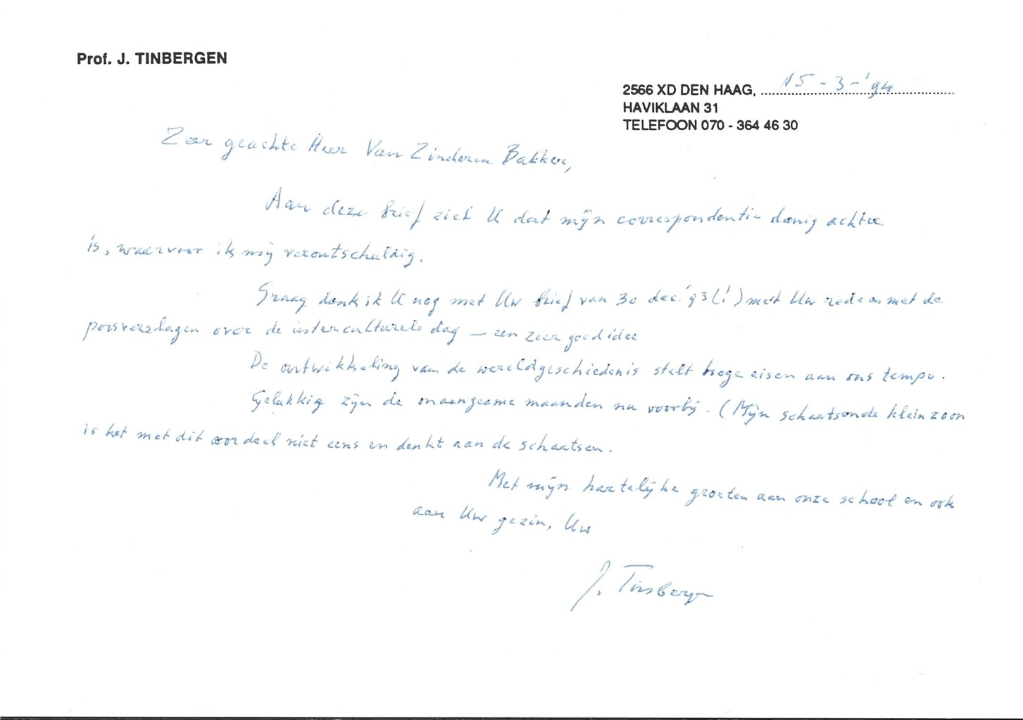 Tinbergen was ook in Nederland de wegbereider van een kosmopolitische visie. Vanaf de jaren vijftig was hij een van de grote pleitbezorgers van ontwikkelingshulp. Met pater Simon Jelsma en dominee Johannes Hugenholtz richtte hij in Nederland de Vereniging voor Internationale Ontwikkelingssamenwerking op. Die vond al snel veel sympathie bij het Koninklijk Huis, en in 1955 sprak koningin Juliana, geïnspireerd door Tinbergen, over een Wereldwelvaartsplan. Tinbergen bleef zich de rest van zijn leven inzetten voor ontwikkelingshulp en stelde daarbij tot doel dat één of zelfs twee procent van het bbp van de ontwikkelde landen naar ontwikkelingslanden zou moeten gaan.