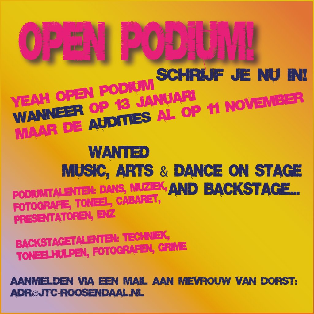 Het 'JTC Open Podium' is het talentenpodium van onze school. Dans, muziek, fotografie, toneel, cabaret, presenteren, backstage & techniek & grimeren & toneelhulp - alles waar je talent voor hebt kan worden ingezet!