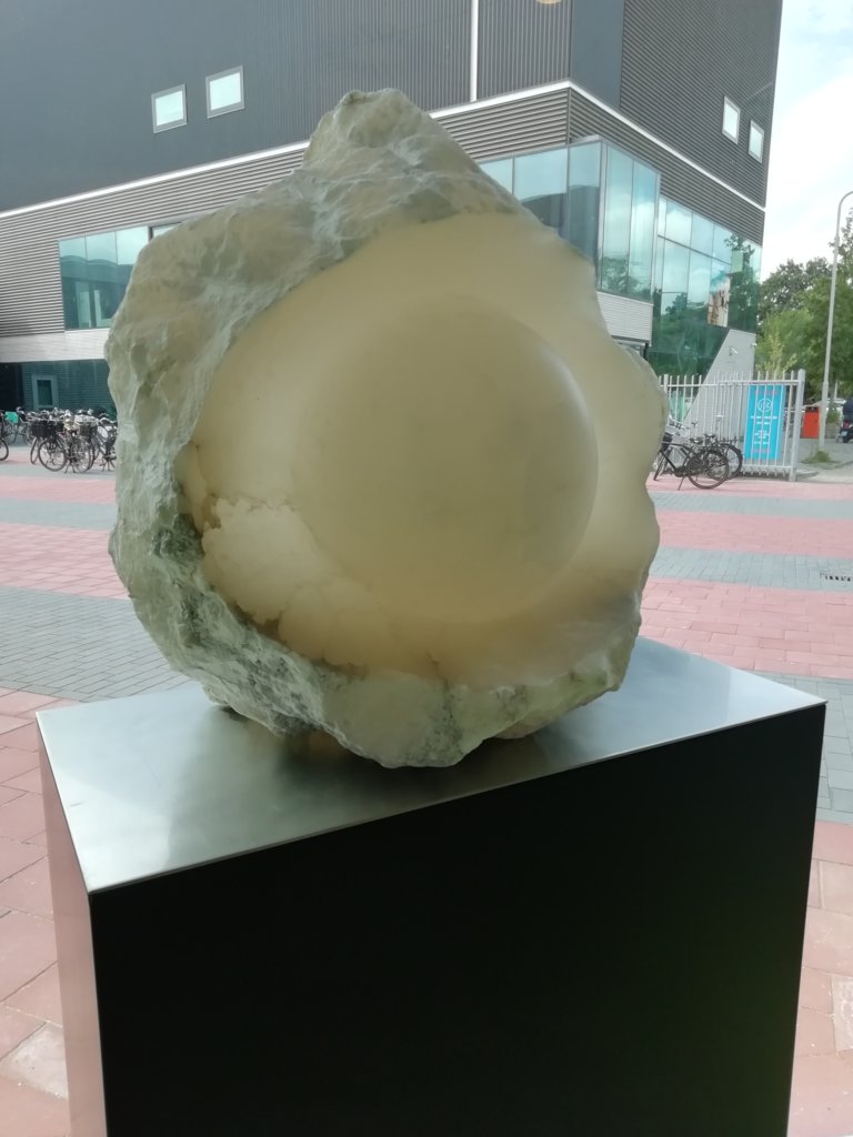 Het beeld is van albast, een witte en soms bijna doorzichtige steensoort. De maker vertelt erover: 'Albast wordt gevonden in de vorm van ruwe, knolvormige stenen. De buitenzijde is ruw en soms ook scherp. De steen binnen die knol is prachtig, vaak dooraderd met allerlei andere steensoorten, met kristallen, met breuk- en kraakvlakken die bij het ontstaan zijn ingebouwd. Het albast zelf kan heel licht zijn, heel transparant, de toevoegingen zorgen daarbij voor kleurnuances. Het werk heeft een plek nodig waar het vanaf de achterzijde wordt belicht en aan de voorzijde wordt bekeken - zo wordt het schijnsel heel goed zichtbaar. Daarbij kan het verschil tussen ochtendlicht en avondlicht ook voor mooie kleurnuances zorgen. Op het JTC heeft het beeld de optimale plek gekregen - vlak voor prachtige grote raamvlakken waar vanaf het middaguur het licht naar binnen scheert."