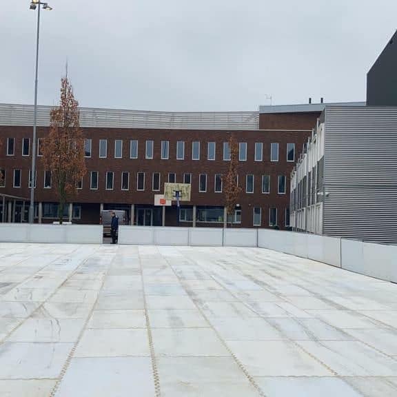 "Volgende week zullen de leerlingen van klas 1,2,3, hun enkel uur LO buiten volgen. Als buitensportfasciliteit gaan we een kunststof schaatsbaan op het schoolplein laten leggen. Je kunt schaatsen lenen of die van jezelf meenemen. Handschoenen zijn verplicht.