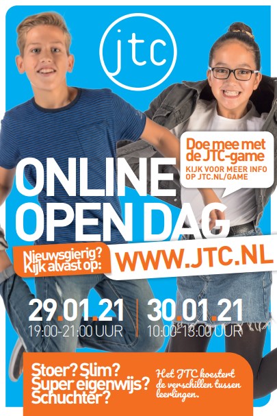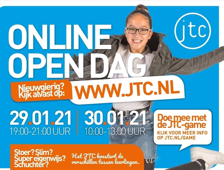 De JTC OpenDag is ONLINE - we mogen helaas niemand in ons gebouw ontvangen. Maar op VRIJDAG 29 JANUARI (19.00-21.00 uur) en op ZATERDAG 30 JANUARI (10.00-13.00 uur) kun je wel héél veel: