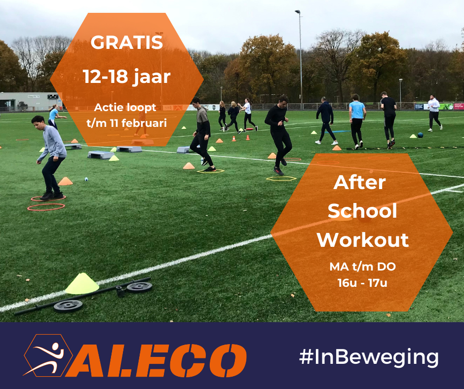 Aleco biedt jongeren tussen 12 en 18 jaar de mogelijkheid om op maandag t/m donderdag van 16.00 - 17.00 uur, GRATIS te komen sporten tijdens de After School Workout! Een leuke, actieve en verantwoorde workout in de buitenlucht met leeftijdsgenoten. Je hoeft geen abonnement af te sluiten. Wel vragen we je aan te melden via info@aleco.nl. De actie loopt tot en met 11 februari (mogelijke verlenging afhankelijk van de geldende maatregelen)