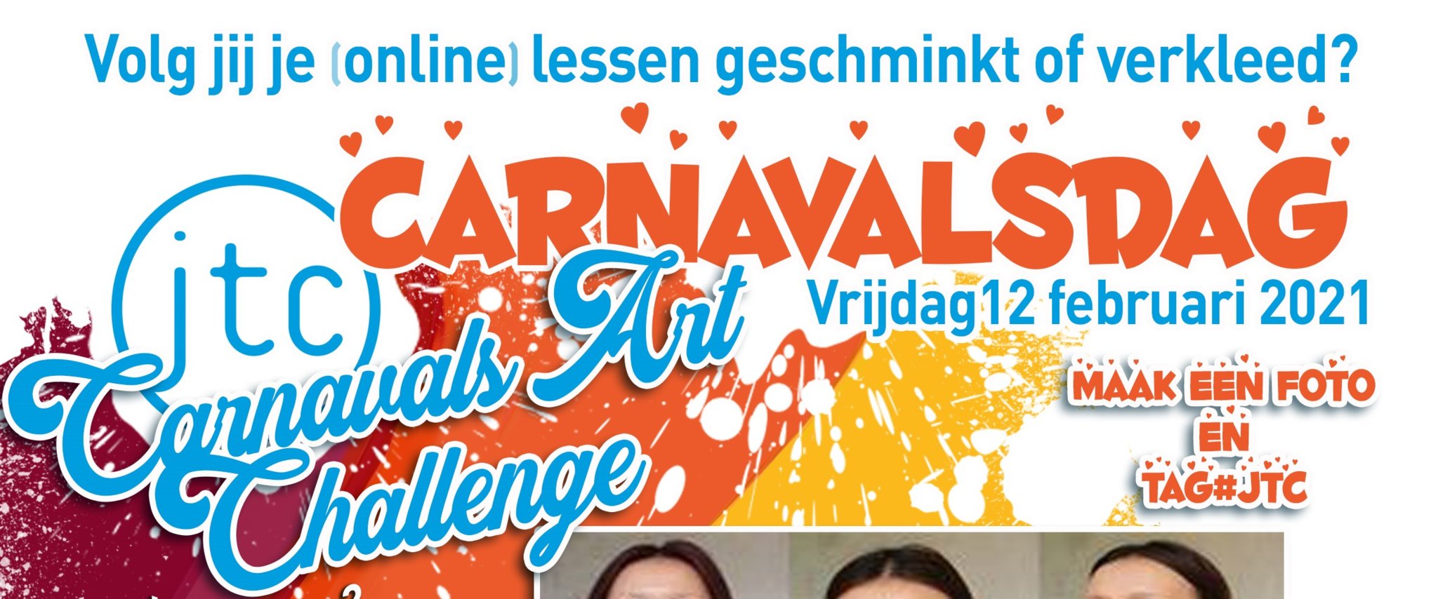 Maar wij als JTC willen deze feestdagen niet vergeten en daarom willen we iedereen vragen om op vrijdag 12 februari verkleed of geschminkt je (online) lessen te volgen.