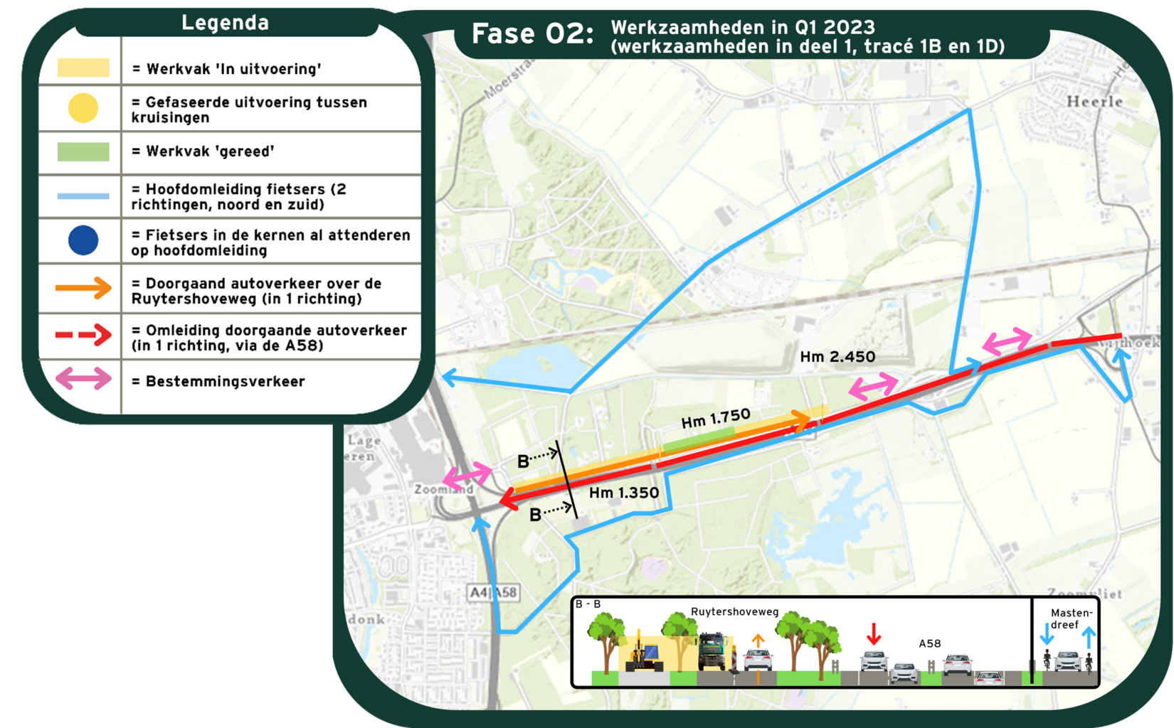 Het huidige fietspad vanuit de richting Roosendaal naar Bergen op Zoom is tijdelijk niet bereikbaar. Fietsers moeten omrijden via de Mastendreef, aan de zuidkant van de A58 of via de Boerenweg/Torenbaan/Bergsebaan aan de noordzijde van de A58. Deze route is aangegeven met een blauwe lijn op het kaartje in de bijlage.